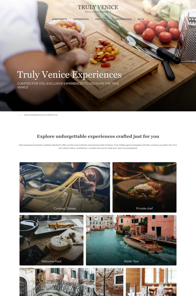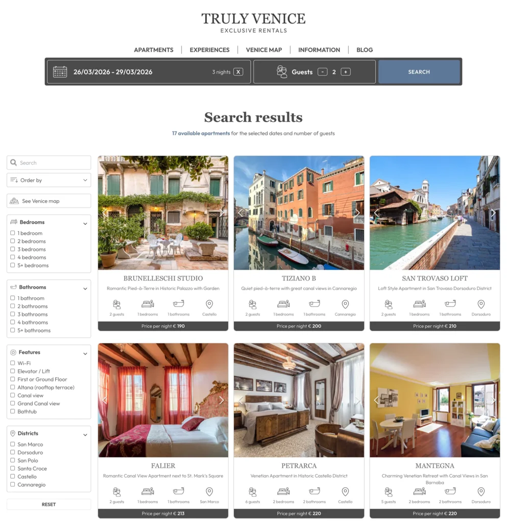 Truly Venice è un portale di prenotazione di appartamenti ed esperienze a Venezia, con oltre 70 strutture gestite e una forte presenza sui canali OTA come VRBO e Airbnb. Il portale è sempre stato un asset centrale del business, sia per la vendita diretta sia per la gestione operativa delle prenotazioni.